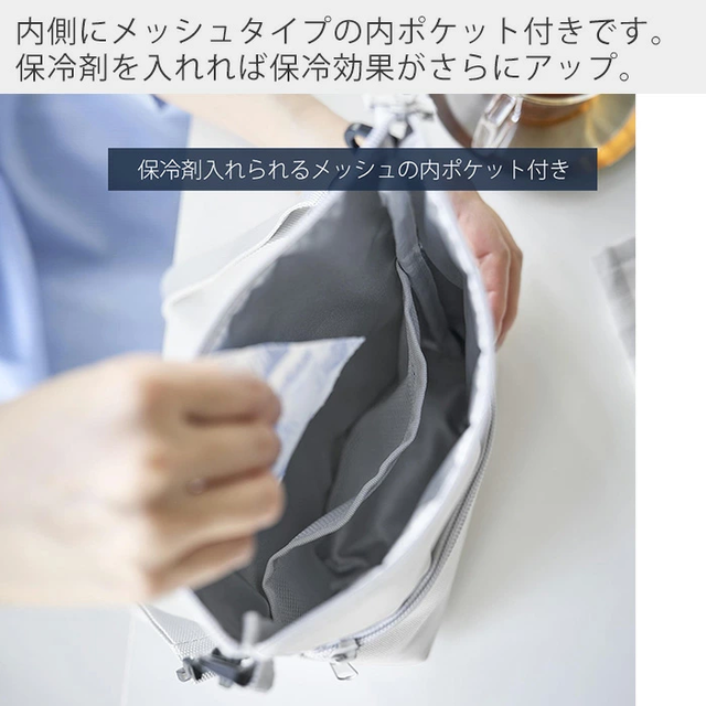 内側にあるメッシュポケットには保冷剤も収納可能で、夏場のアイスの持ち運びにも重宝します。