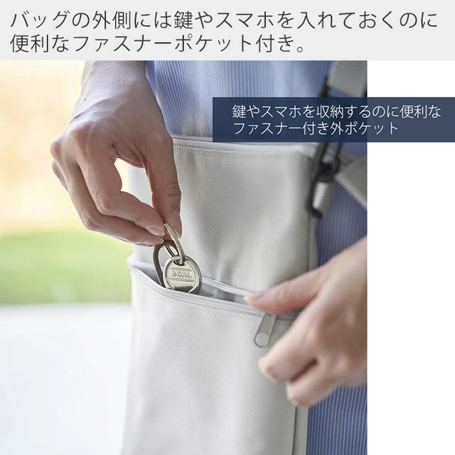 ファスナー付きで開口部を閉められるため、冷気や熱が逃げにくい構造なのもGOOD。中身が飛び出ないので、移動中も安心ですね。