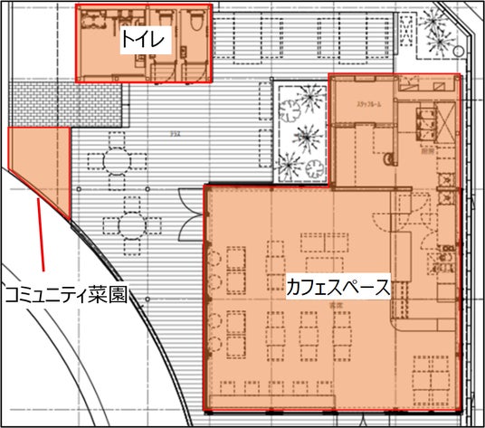 Park-PFI事業区域内にできるカフェは国産木材を活用し建設され、公園利用者が利用できる男女別の洋式トイレ及びバリアフリートイレや地域の方々と協力して野菜や草花を育てることができるコミュニティ菜園が設置されます。※トイレについては、カフェが営業している時間内であれば、公園利用者も利用できます。また、カフェの定休日についても10:00~18:00は利用可能となっております。