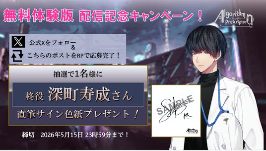 『アルプレ【公式】Algorithm Prescription』X(https://x.com/algorithm_pre )では無料体験版の配信を記念して、攻略対象3名の声優を務める深町寿成さん、石谷春貴さん、土岐隼一さんのサインをプレゼントするキャンペーンを開始いたしました。応募詳細については公式Xをご確認ください。