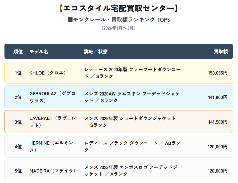 エコスタイル宅配買取センター:モンクレール買取動向レポート(集計期間:2026年1月~2026年3月)