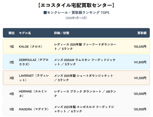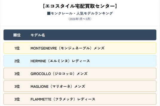 株式会社スタンディングポイント(本社:東京都目黒区、代表取締役:若森 寛)が運営するブランド買取専門サービス「エコスタイル宅配買取センター」は、2026年1月から2026年3月におけるモンクレール(MONCLER)の買取実績をもとに、モデル別ランキングを集計・発表しました。