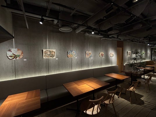 月ごとに表情を変えるカフェの壁面展示スペース「La RINA Cafe Wall Art」。縁煌プロデュースによる工芸・美術作品の展示販売を実施