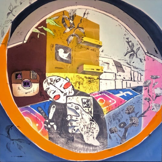 身近な風景や感情といった日常の断片を、視覚と概念的な深みを持つ表現へと昇華させることを試みています。染色技法の蝋けつ染めと木版画を融合させた独自の手法で、日常に潜む「美しさ」と「おかしみ」を染色表現しています。布に版画を捺染して形を転写し、その反転する面白さや版特有の温かみを活かしながら、ろうけつ染めの重層的な色の奥行き、滲み、ぼかしを重ねていきます。計算と偶然が視覚的に響き合う中で、素材の布へとアプローチしています。