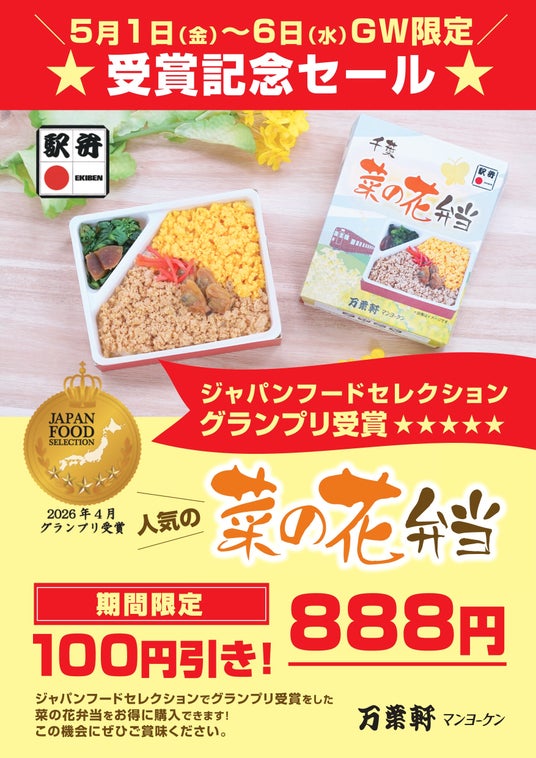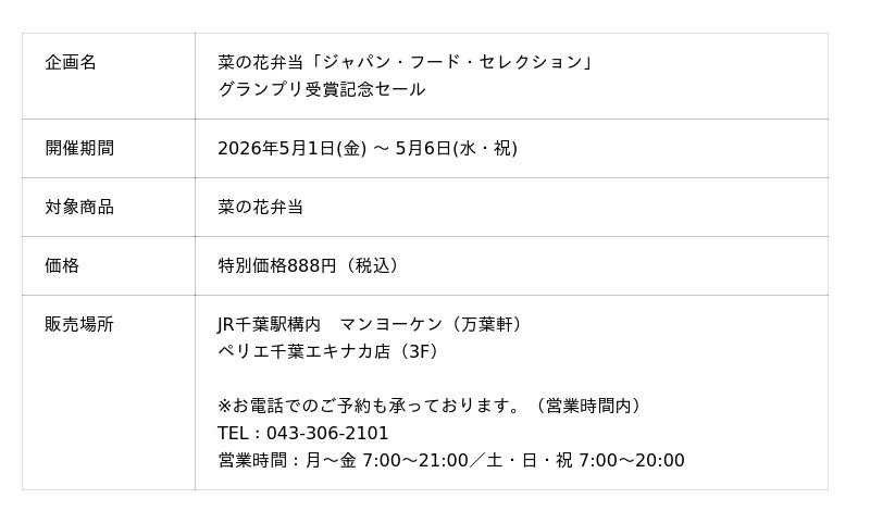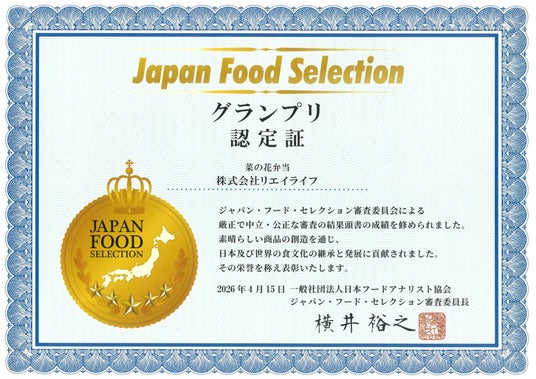 リエイグループの株式会社リエイライフ(本社:千葉県浦安市、代表取締役社長:椛澤 大樹)が展開する千葉県の老舗駅弁ブランド「マンヨーケン(万葉軒)」は、2026年4月度の第98回「ジャパン・フード・セレクション」において、当社のロングセラー駅弁『菜の花弁当』が、最高評価であるグランプリを受賞しました。