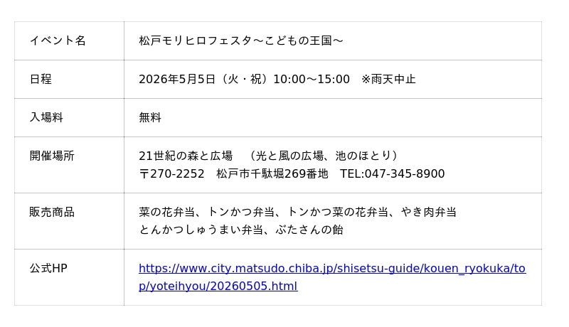 5月5日(火・祝)「松戸モリヒロフェスタ~こどもの王国~」にて、マンヨーケン(万葉軒)が初出店!親子の絆が深まるような体験型のワークショップ、キッチンカー、物販が充実!