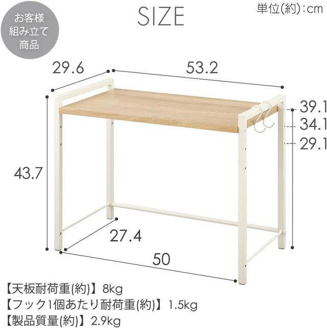 サイズは約53.2cm(幅)×約29.6cm(奥行き)×約43.7cm(高さ)。天板の耐荷重は8kg、全体で約11kgの設計でケトルやトースターも安心して置けます。