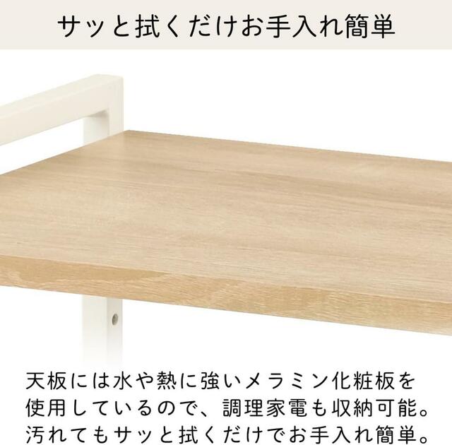 天板はメラミン樹脂加工を施しており、水や熱に強いのもポイント。電子レンジの熱がこもりにくく、汚れてもサッと拭き取れるお手入れのしやすさが魅力です。