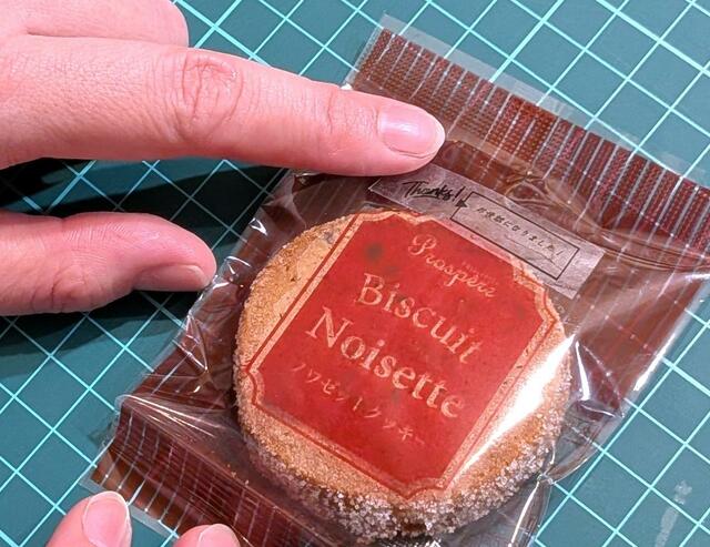 最後に、テンプレートでギフトラッピングを作ってみました。友人へのお礼に渡すお菓子に「Thanks!」ラベルを張り付けていきます。