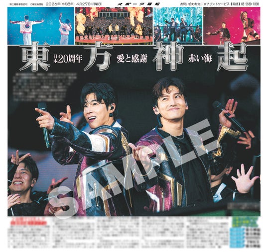 スポーツ報知を発行する報知新聞社(代表取締役社長・長谷川剛)は新聞の一部紙面をコンビニエンスストアのマルチコピー機からプリントできる「スポーツ報知コンビニプリント」サービスを展開中。スポーツ紙ならではの大きな写真を使った紙面をプリント版として販売しています。4月25日、26日に日産スタジアム周辺で発売、2人のインタビューを収録した「東方神起特別1面新聞」のコンビニプリントを発売中です。また、27日付けのライブの模様を伝える紙面も発売中です。