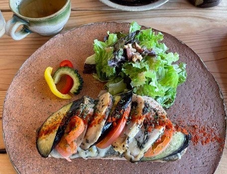 「CLAY Coffee & Gallery」チキンと焼き野菜のタルティーヌとドリンクセット(1人前)2,100円 「CLAY」のためだけに作られた器が揃う、やちむん愛好家にはたまらないお店。