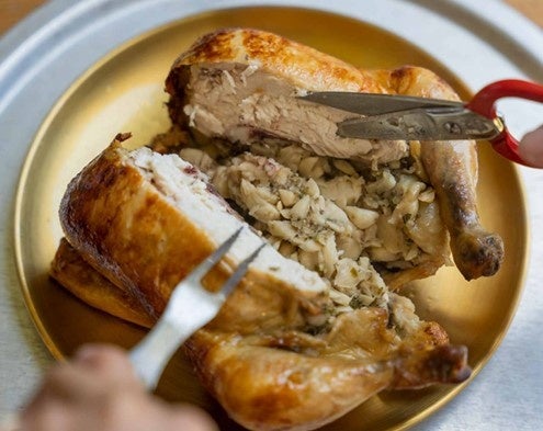 沖縄県産やんばる若鶏のお腹ににんにくをたっぷりと詰めて、お酢とにんにく、ハーブなどを合わせた秘伝のたれに2日間漬け込み、丸ごとこんがりと焼き上げます。