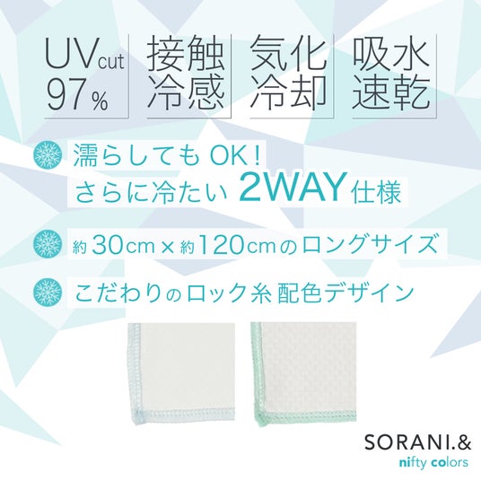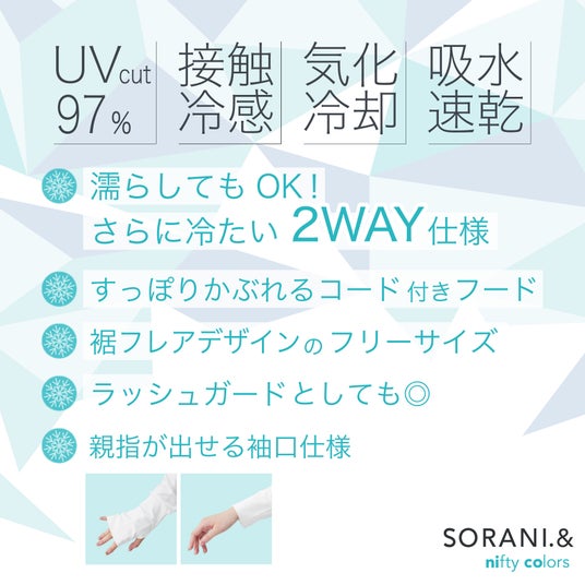 レイングッズメーカー株式会社ニフティカラーズ(本社:東京都墨田区)は、新ブランド「SORANI.&(ソラニアンド)」から、UVカットと冷感機能を兼ね備えたパーカーとスカーフを2026年4月下旬より順次発売いたします。