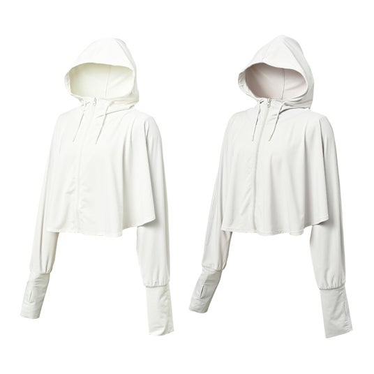 裾がフレアになったショート丈は着た時のバランスが良く、身幅が広くウエスト部分の締め付けもないのでゆったり着用できます。フードを被れば髪や首周りの日焼けも防げます。袖口から親指が出せるサムホール付きなので日焼けしやすい手の甲までカバー。袖口を手首まで上げれば普通の袖口となリます。シンプルなデザインは、スポーツなどのアクティブシーンにも、いつものリラックスシーンにも幅広いスタイルに合わせていただけます。