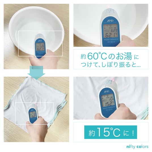 社内実験では、約60度のお湯につけてから絞り、振ると、約15度にまで下がる結果がでています。