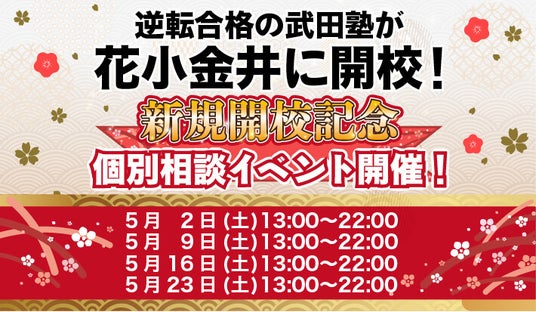 学習塾「武田塾」を全国に展開している株式会社A.ver(本社:東京都文京区 以下「武田塾」)は、5月1日、東京都花小金井に武田塾花小金井校を開校することをお知らせいたします。武田塾花小金井校の開校を記念して、花小金井校では個別相談イベントを実施いたします。開催予定は以下の通りです。5月2日(土) 13:00~22:005月9日(土) 13:00~22:005月16日(土) 13:00~22:005月23日(土) 13:00~22:00