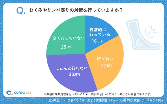 むくみやリンパ滞りの対策を「ほとんど行わない」(30.0%)、「全く行っていない」(25.3%)を合わせると、55%以上が未対策だと分かります。