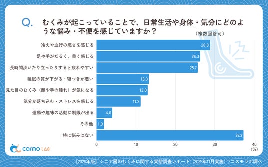 シニア専門のマーケティングプラットホーム コスモラボ(会社名:コスモヘルス株式会社、本社:東京都港区、代表取締役社長 小塚 崇史)がシニア層の『むくみ』に関するアンケートリサーチのレポートをリリースしました。