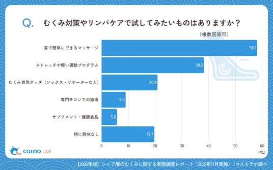 「家で簡単にできるマッサージ」(58.1%)と回答した層が突出し、「ストレッチや軽い運動プログラム」(38.2%)、「足のむくみ専用グッズ」(20.9%)という回答が続きました。