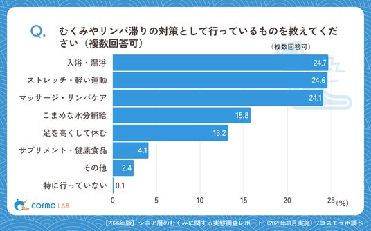 「入浴・温浴」(24.7%)、「ストレッチ・軽い運動」(24.6%)、「マッサージ・リンパケア」(24.1%)がほぼ同水準で上位を占めました。