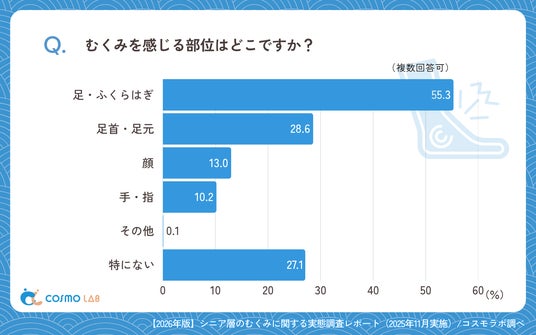 「足・ふくらはぎ」(55.3%)と回答した層が最多で、その後「足首・足先」(28.6%)、「特にない」(27.1%)、「顔」(13.0%)という回答が続きました。