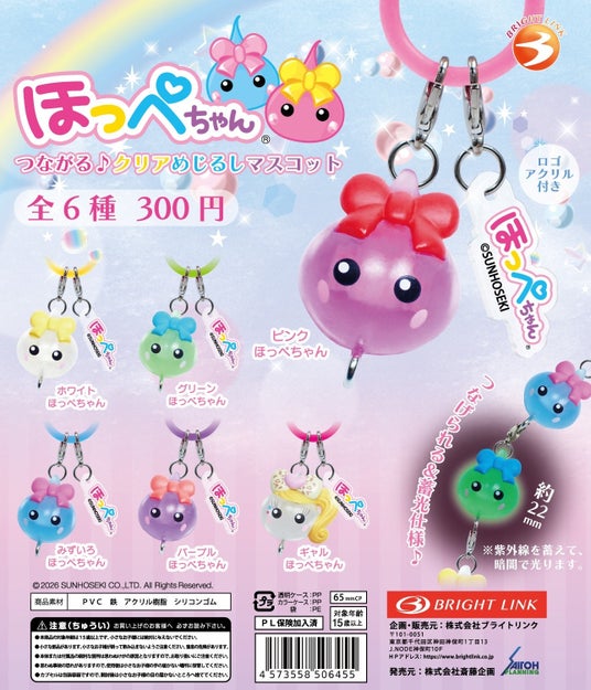 メモリーテックつくば株式会社 インタラクティブコンテンツ事業部 サン宝石(所在地:山梨県中央市、代表取締役社長:鈴木伸也、以下「サン宝石」)は、株式会社ブライトリンク(本社:東京都千代田区、代表取締役社長:藤田明香里)との協業により、新商品 「ほっぺちゃん つながる♪クリアめじるしマスコット」 を、2026年5月下旬より全国のカプセルトイ自販機にて順次発売いたします。