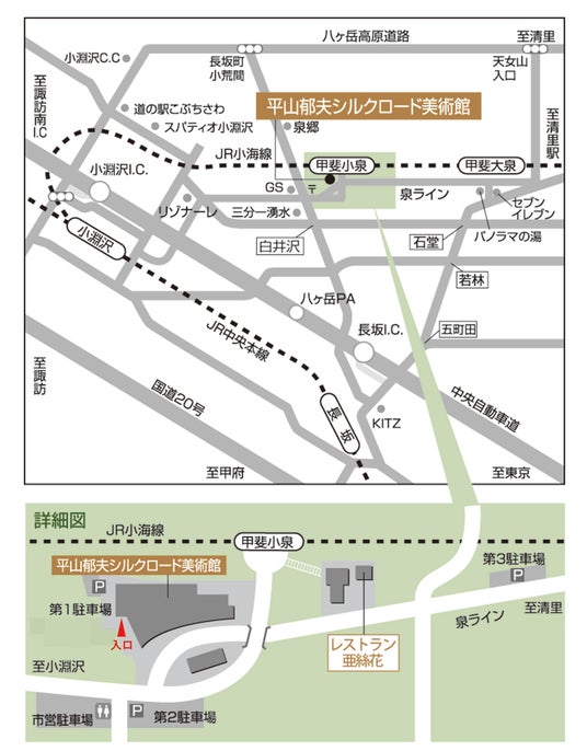・小淵沢ICより約10分。八ヶ岳高原ライン小荒間交差点を右折後、踏切を越えてすぐ左折後300m