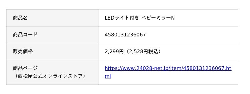 株式会社西松屋チェーン(兵庫県姫路市、代表取締役社長:大村浩一)は、車の後部座席のヘッドレストに取り付けることで、運転席から後ろ向きチャイルドシートに乗ったお子様の様子を確認できる「LEDライト付き ベビーミラーN」を全国の当社店舗および公式オンラインストアにて発売いたしました。