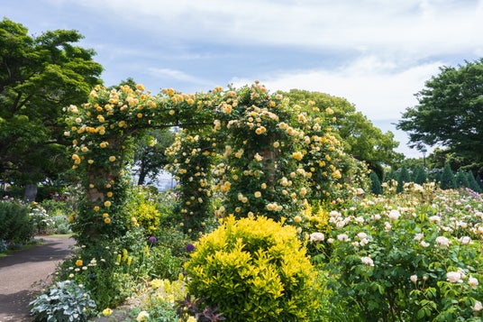 「バラと輝く噴水の庭」をテーマの庭園で、横浜ベイブリッジなど港の風景も楽しめる高台のバラスポットです。