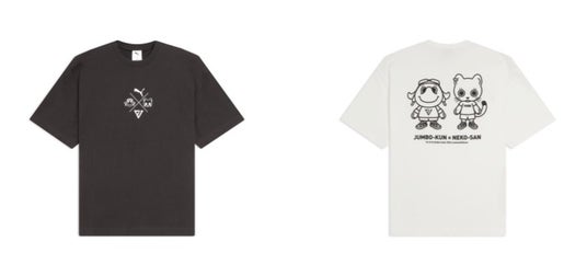 本コレクションは、ジャンボくんとNEKO-sanによる初コラボレーションとなり、NEKO-sanの世界観にジャンボくんが入り込んだ特別なビジュアルが特徴です。2人がまるで昔からの親友のように並ぶデザインは、バスケットボールの枠を超え、日常のファッションとしても楽しめる、遊び心あふれる仕上がりとなっています。ラインアップは、これからのシーズンに活躍するTシャツとソックスの2アイテムを展開します。