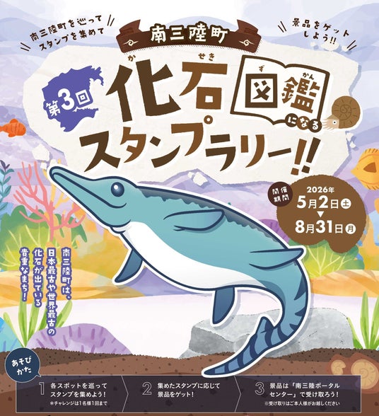 「化石スタンプラリー」は今年で第3回目となる「化石」×「スタンプラリー」企画です。今年はGW~夏休み中にイベントを開催。南三陸町内の様々なスポットを巡り、町から実際に発見された「古生物」たちのスタンプを集めていきます。スタンプラリーブックを埋めていくと化石図鑑が完成します。本イベントは第3回の開催となり、前回までの内容を一部見直し、より多くの来訪者に楽しんでいただけるようアップデートしています。
