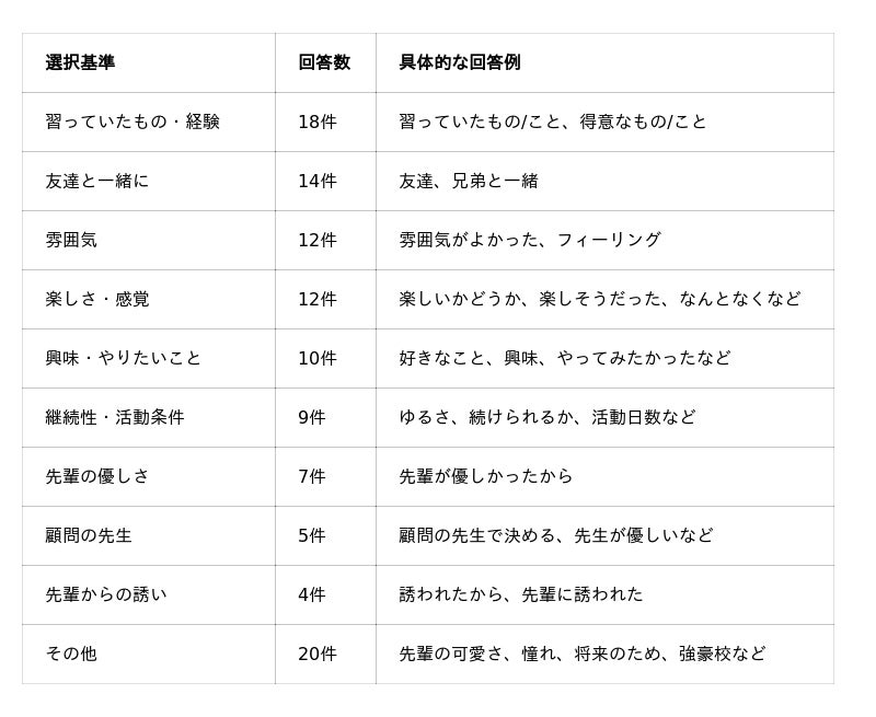 - 継続性と人的魅力も重要な判断軸「無理なく続けられるか」という継続性(9件)に加え、「先輩の優しさ」(7件)「顧問の先生」(5件)「先輩からの誘い」(4件)など、特定の人物の魅力や関わりが選択の要因として無視できない存在感を示しています。