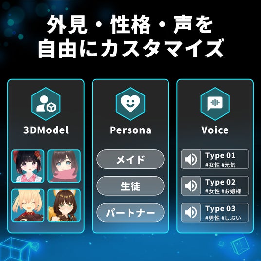 キャラクターの設定や性格、声も自由に設定。設定によってキャラクターの日々の行動や会話内容が変化し、あなただけのキャラクターとして共に生活します。