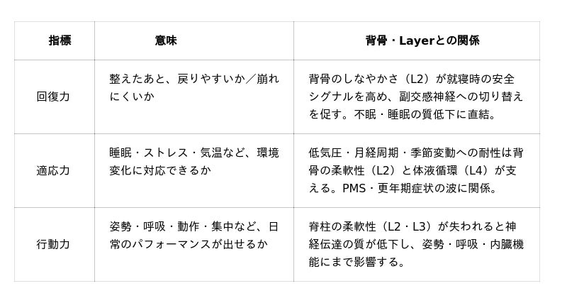 ブレシア(R)は、健康を単に「痛みがある/ない」ではなく、以下の3つの指標で捉えます。背骨の柔軟性を高めることは、この3指標すべてに直結します。