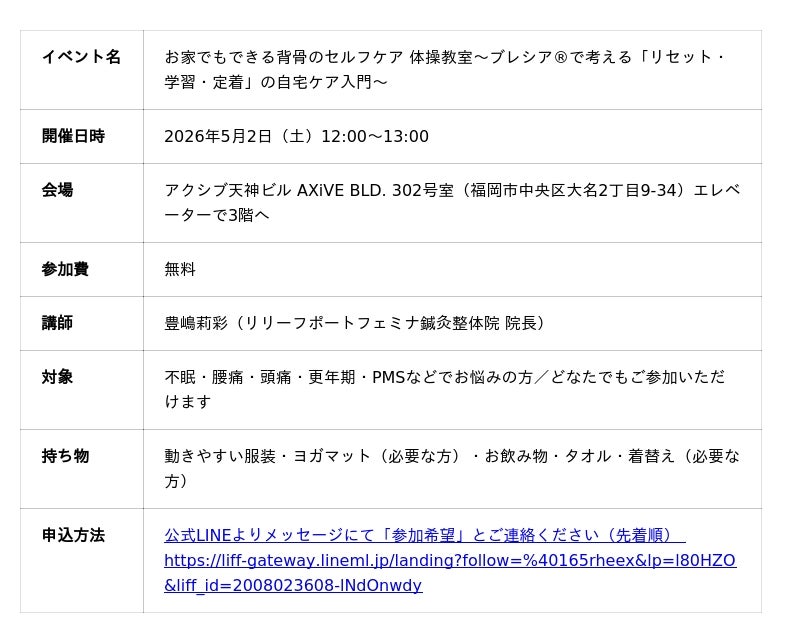 Emaps株式会社(代表:宇土佳奈)が運営する女性専用整体院「リリーフポートフェミナ鍼灸整体院(福岡市中央区大手門)」は、2026年5月2日(土)12:00~13:00、福岡・天神にて「お家でもできる背骨のセルフケア 体操教室」を無料開催いたします。本イベントは、当院が採用する独自臨床モデル「ブレシア(R)(brascia(R)/商標登録 第6920621号)」の思想に基づき、不眠・腰痛・頭痛・更年期・PMSなどの不調を中長期的に改善するための「自宅ケアの土台づくり」を体験していただく取り組みです。