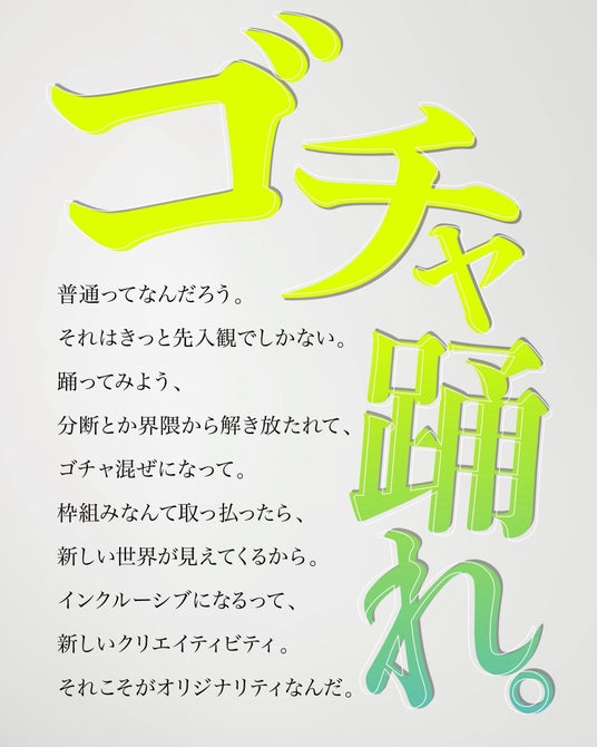 障害のある・ないダンサーが1つのチームとして生み出す、新たなクリエイティビティとオリジナリティを競い合う、世界でも類を見ないダンスコンテストをメインコンテンツとして、全国規模で障害のあるなしを超えて、誰も参加できるダンスのムーブメントを広げるプロジェクト。26―27の初開催をきっかけに、今後すべての人が「ごちゃ踊れ。」のコピーのもと踊ることを介してつながることを目指す取り組みです。全国大会参加チームを選出する全国5都市での地区予選に先駆けて、5月からチームづくりの場となるワークショップを各地で実施します。