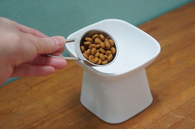 早速、山崎実業の「食べやすい高さ陶器ペットフードボウル ヌークス」を使ってごはんを食べてもらいます。