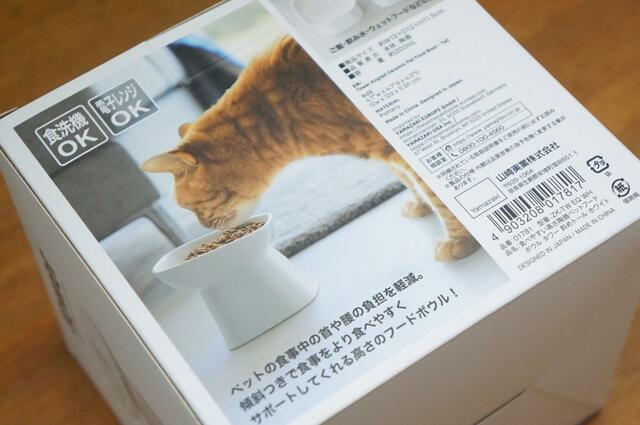こちらが我が家の猫ちゃんのお誕生日に届きました、山崎実業の「食べやすい高さ陶器ペットフードボウル ヌークス」。