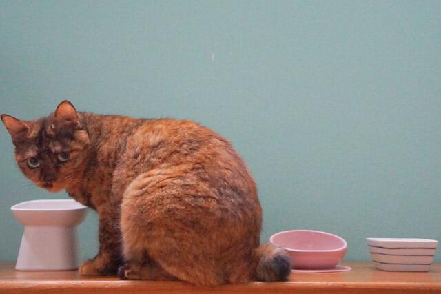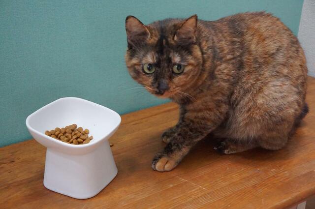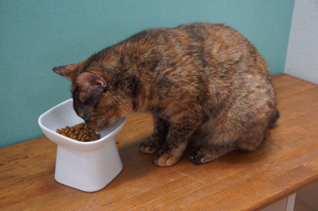 ちょっと顔を落とすだけで食べられるので、首も腰も楽そう! いつもよりも少しゆっくり落ち着いて食べてくれてる気がします。