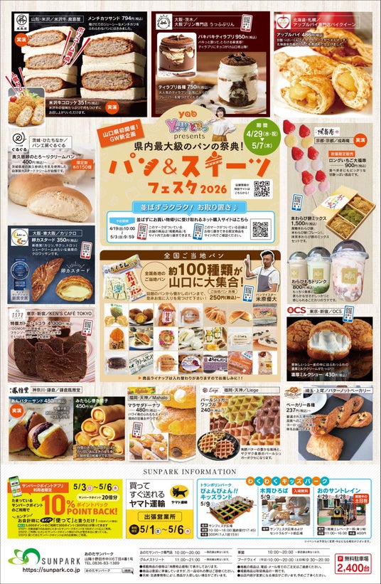 山口県を拠点に展開する富士商グループホールディングス株式会社(本社:山口県山陽小野田市稲荷町10-23 代表取締役:藤田 敏彦)の小野田商業開発株式会社が運営をおこなう複合商業施設「おのだサンパーク」は、2026年4月29日(水・祝)~5月7日(木)までyab山口朝日放送「You!どきっ」プレゼンツとして、パン&スイーツフェスタ2026を開催しており、館内が賑わいを見せています。