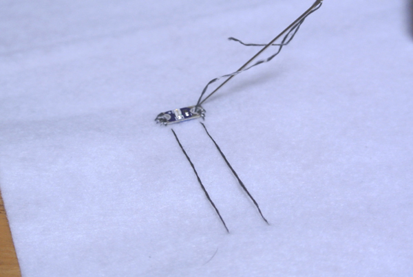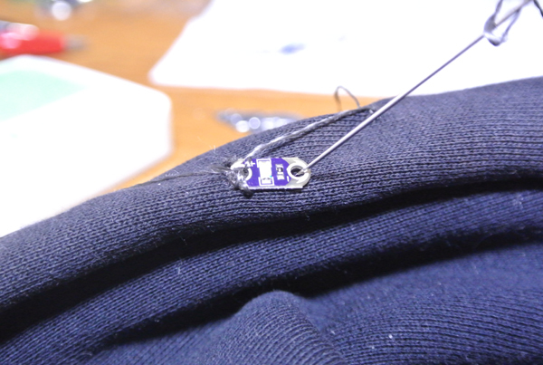 針を使って導電糸を縫います。リード線を使ったハンダ付けと違って、電気を通す部分が裸の状態なのでショートしないように気をつけて、プラスとマイナスの糸の道を分けながら縫いましょう。
