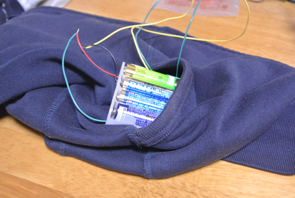 電源をパーカーのポケットにしまって完成です。線は内側を通したので、外側には線が見えないようにしました。