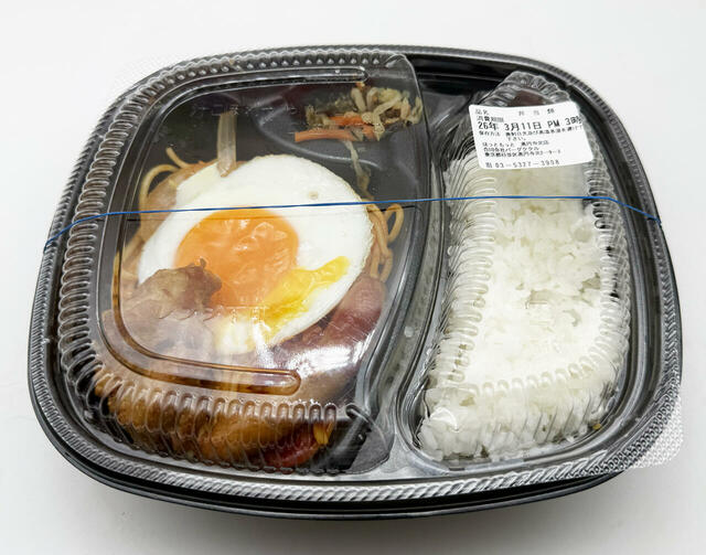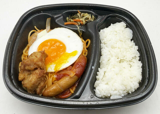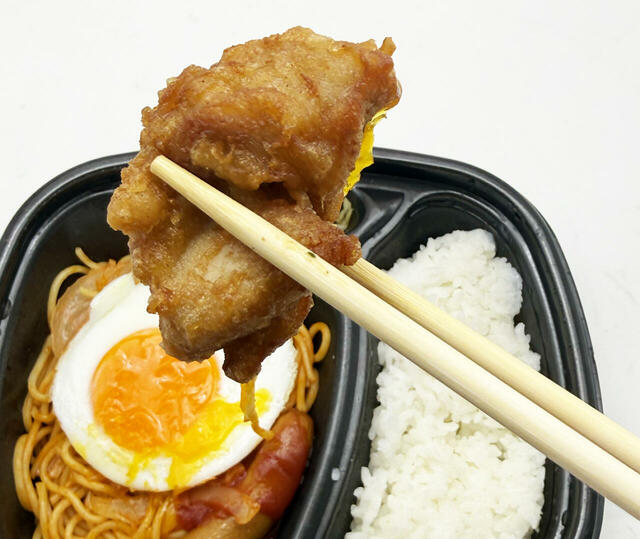 まず、おかずの目玉焼きはカウンターでオーダーしてから1つずつ焼く仕組みで、なかなか手が込んでいると思いました。そして、弁当の蓋を開けてみると、ナポリタンの上に目玉焼き、唐揚げ、ウインナーがおかずとして添えられていて、これらもまた焼きたて、揚げたての味わいでかなりの好印象です。