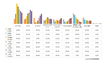 15~59歳の男女2000人と小中学生214人のうち、何かしらのデバイスで音楽を聴いていると回答した15~59歳の男女1704人と小中学生151人を対象に、音楽聴取時に利用しているデバイスについて聞いたところ(複数回答可)、小学生が「ゲーム機」、中学生~30代が「スマートフォン」、40~50代が「パソコン」だったという。