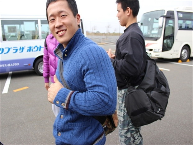 2月末、風はまだ冷たい。移動中はさすがに服を着るマッチョたち。服で筋肉が隠れると、意外に普通の人と変わらない……? と思いきや、やはり肩から二の腕にかけての太さが尋常ではない。