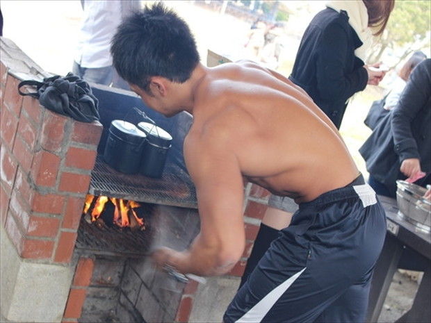マッチョ狩りではしゃいでお腹も空いてきた。お昼はチームに分かれ、飯盒炊飯とカレーライス作り。 ここでホッカイロも配られた。屋外の寒さ対策だけではなく、なるべく冷たい手でマッチョに触らないように、という配慮でもあるらしい。