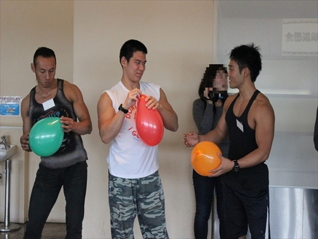 スタッフが頑張って膨らませた風船を、マッチョと参加者の身体に挟んで割るだけ!!