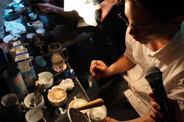 お客さんの似顔絵ラテアートをその場で作成。会場の拍手が多かった方が勝ち。