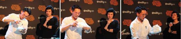 最後に罰ゲームが行われた。内容はなぜか「パイ投げ」。勝ったじょーじさんが、負けたまっつんさんにパイを投げる。