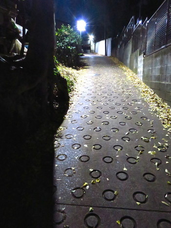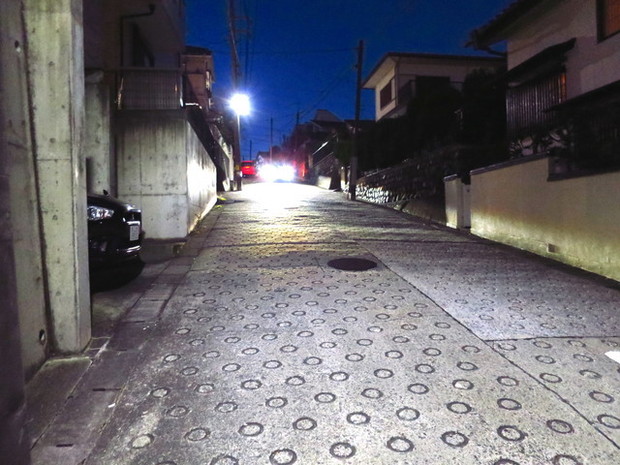 そして目印の南希望ヶ丘町内会館から新幹線が走る南南東方向に下っていくと、路面に、急坂であることを知らせる恒例のドットが現れた。